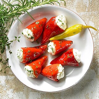 Rote Paprikaglocken, gefüllt mit leckerem Frischkäse.